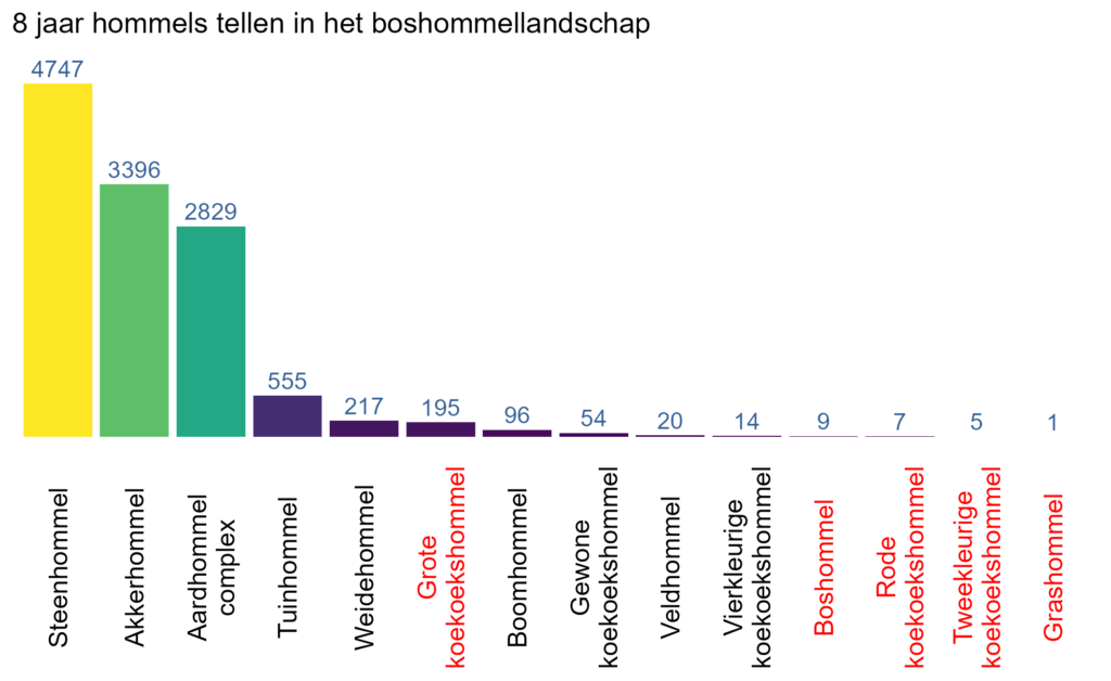 In het boshommellandschap zijn 14 hommelsoorten aangetroffen. Steenhommel, akkerhommel en aardhommel zijn veruit het meest algemeen. Vijf soorten staan op de Rode Lijst (rode soortnamen).